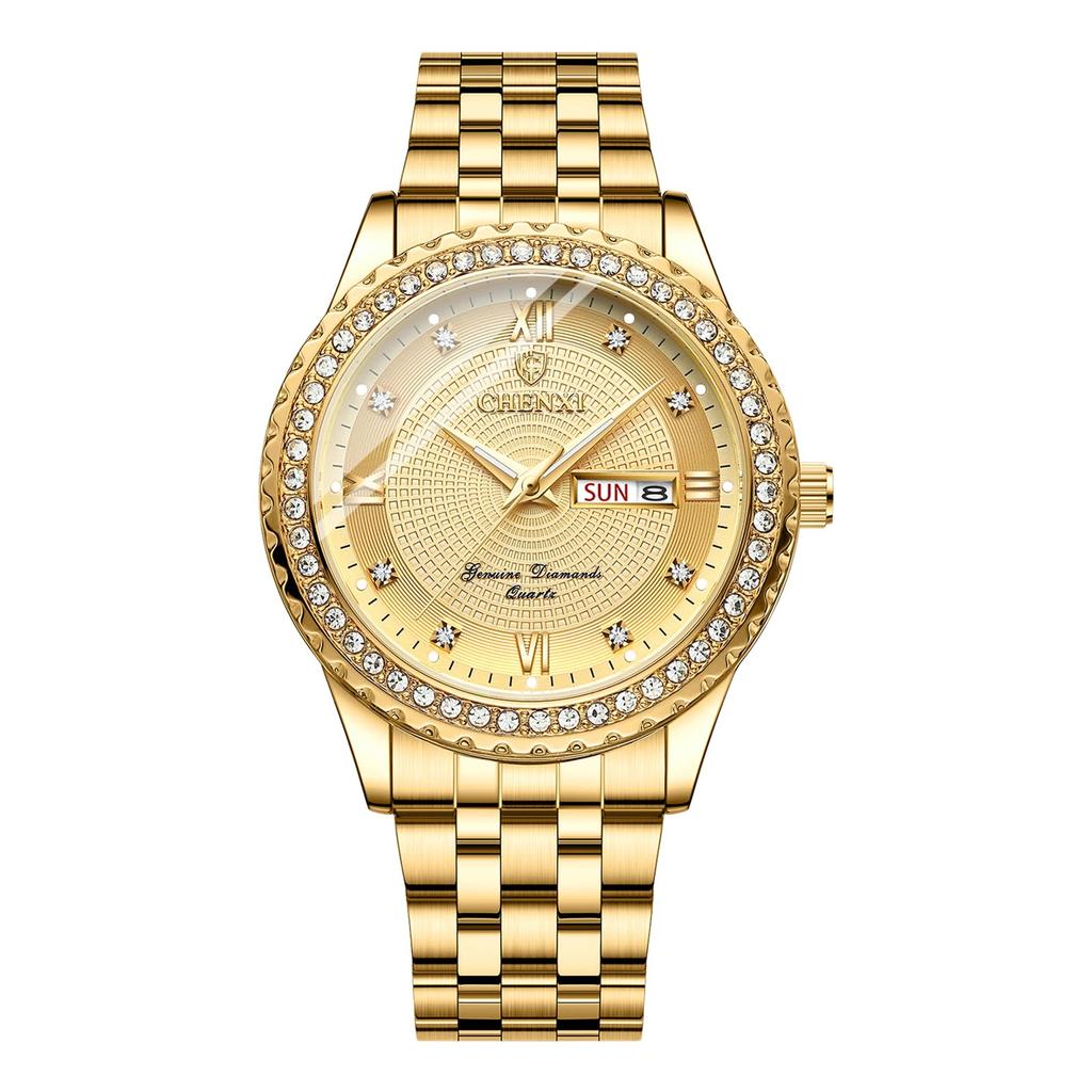 Circular Large Calendar Stainless Gold Bar Pair Respect for the Aged New Year Men's Wristwatch, Rainproof, Dial Dial, Function, Watch, Steel, Strap,