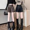 Petite High-Waisted Khaki PU Leather A-Line Shorts for Women - Wrinkle-Resistant, Wide-Leg Bootcut, Autumn/Winter Wear.