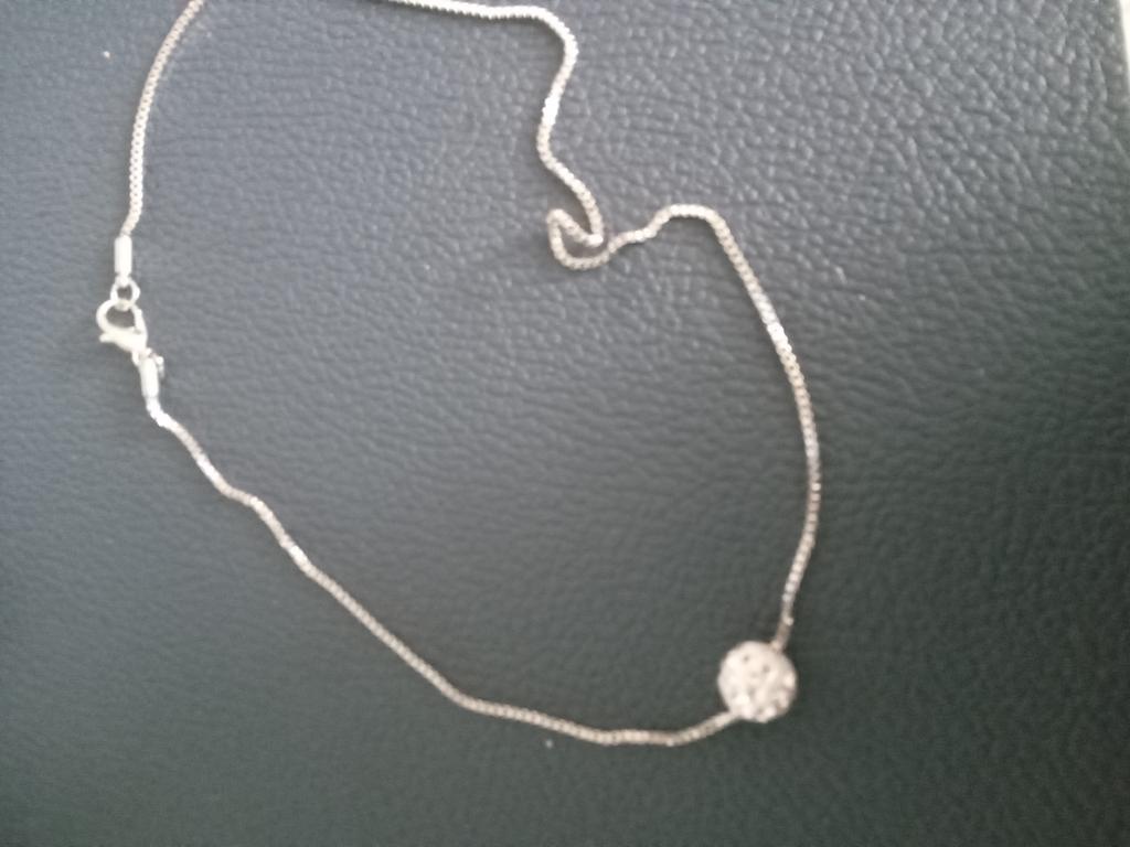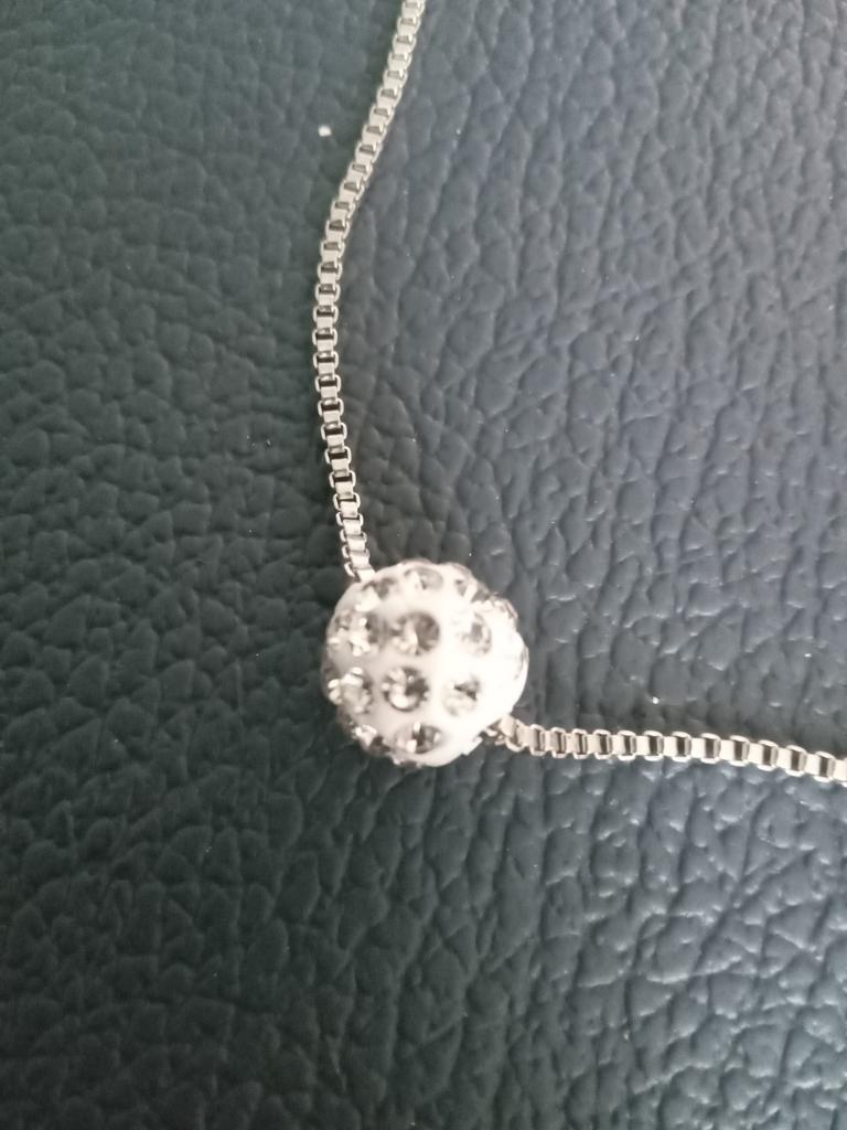 Die Halskette ist etwas lang. Wie auf dem Foto. Der Ball ist eher weiß mit silbernen Glitzern