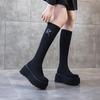 Women's Black Suede Knee-High Boots - 8CM Height Increase, Thick Sole, Plus Velvet, Elastic, 2025 Autumn/Winter Collection