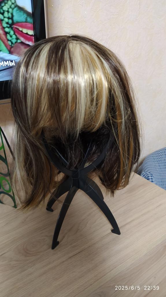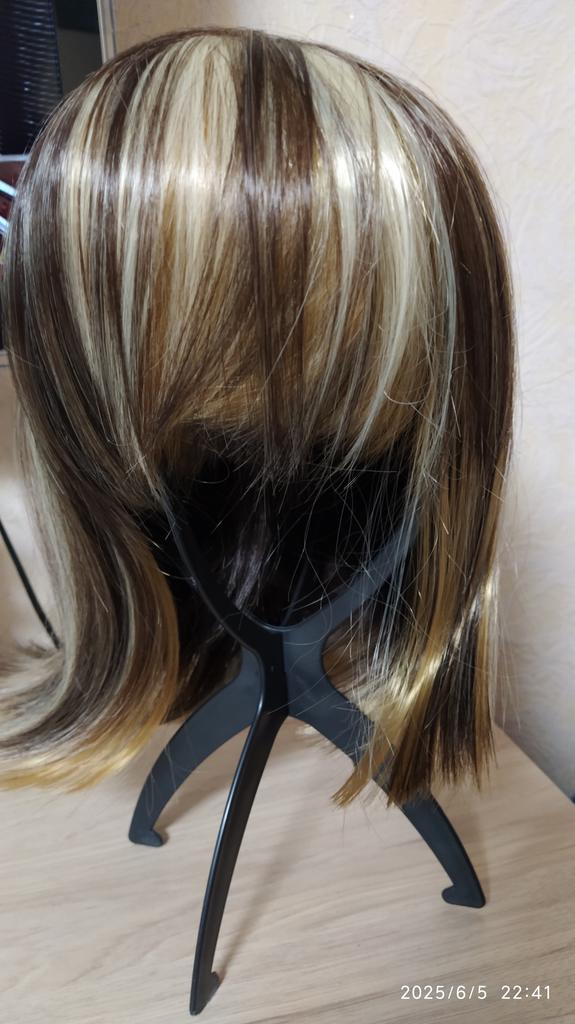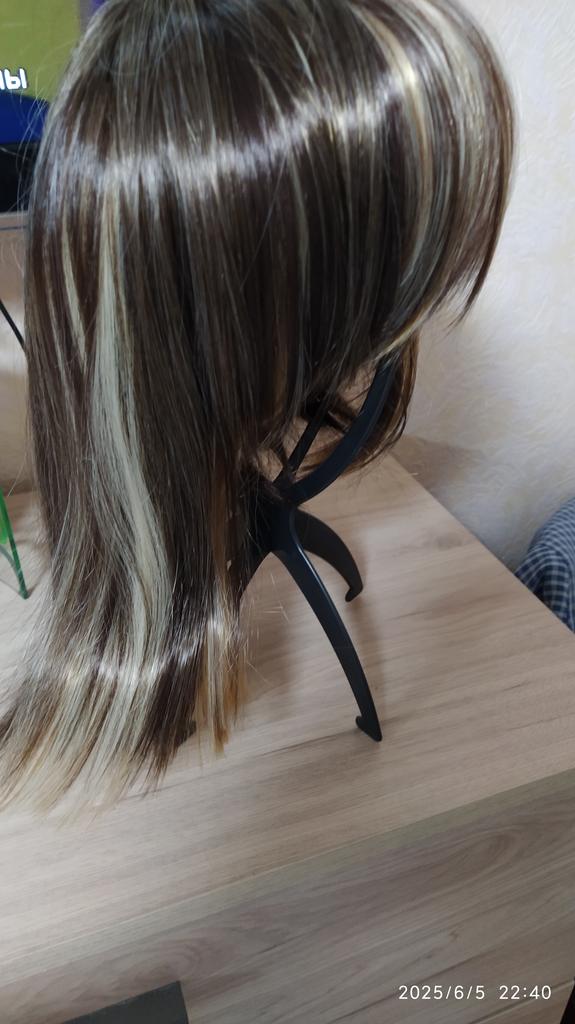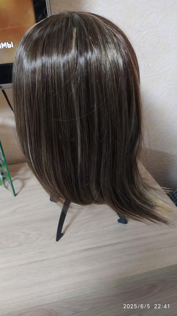The color of the wig does not match the photo. Contrast highlights. Hairstyle does not match the photo. Size adjustment is secured with stitching.