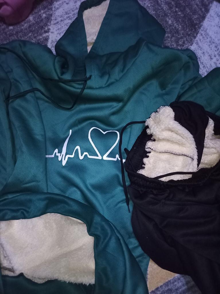 The suit is well sewn, the fabric is synthetic, there is a drawstring on the sleeve, my height is 164cm, weight 72kg, the sweatshirt is good, the sleeves are a bit longish, but that's how I wanted it, but the pants are just right in length, but if tucked into boots it will be fine, I'll see how it wears. All in all, it's plushy and warm.