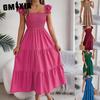 HNXC Summer Solid Color Square Neck Black Ear-trimmed Waist-cinching A-line Long Dress Women's Clothing