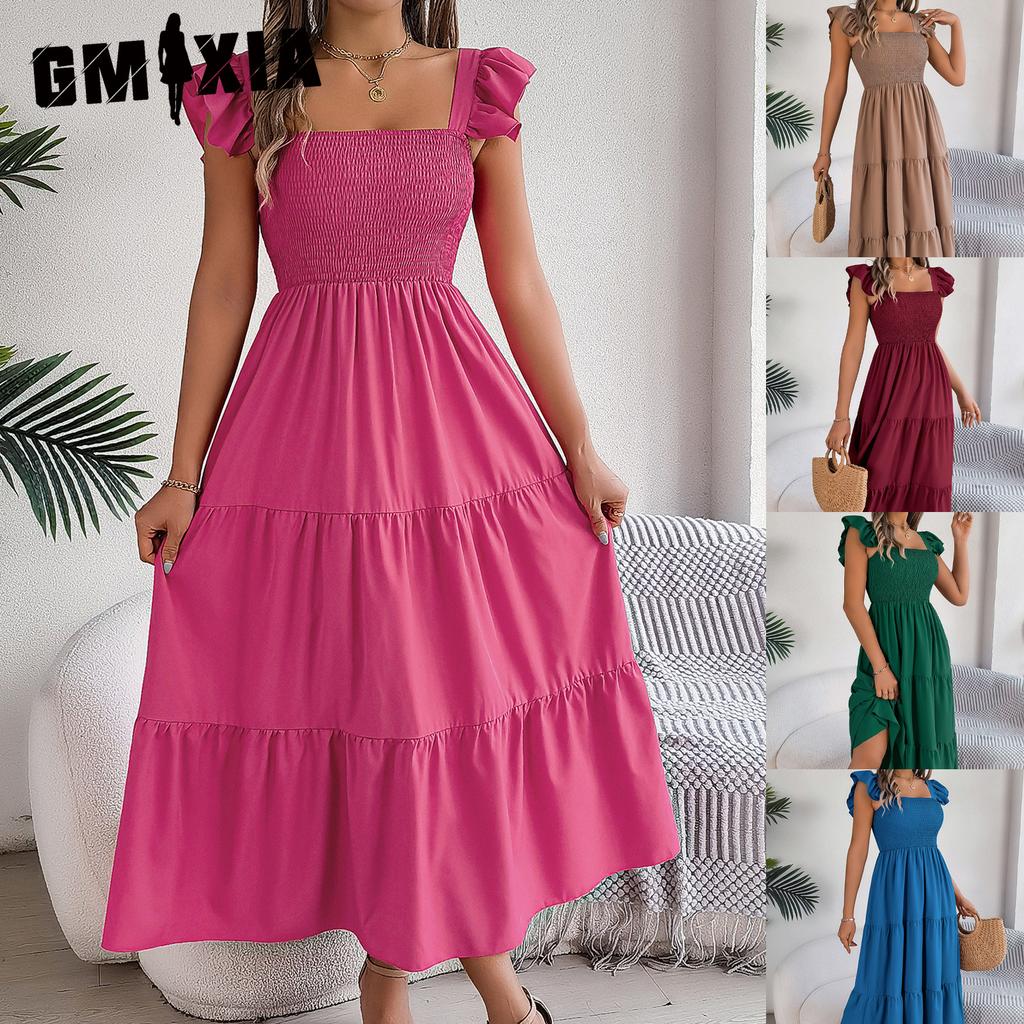 GMXIA Summer Solid Color Square Neck Black Ear-trimmed Waist-cinching A-line Long Dress Women's Clothing