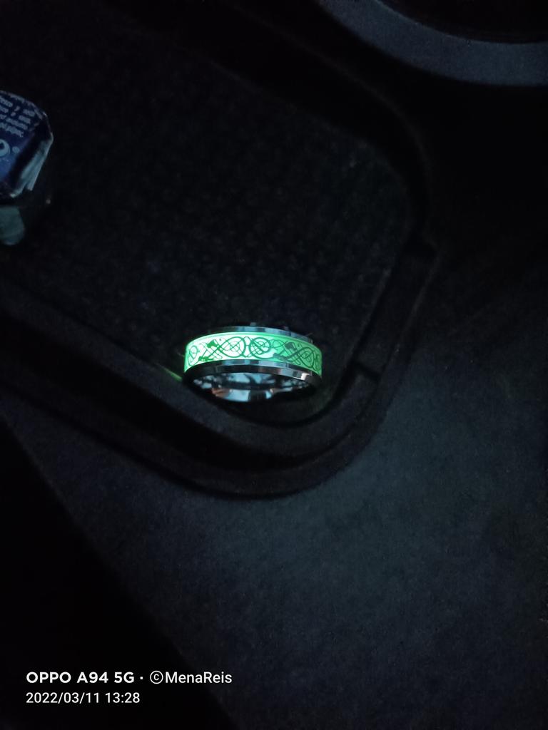 La oss se om det funker med lyset. Den angivelig fluorescerende ringen har åpenbart sine vanskeligheter med å lyse.