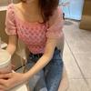 New Style Short-sleeved Spliced puff Sleeves Ice Silk Women's Slim Square Collar Knit Top